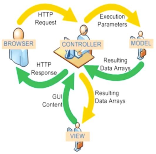 - 用户在浏览器中发送请求之后,browser 把这个请求发给了 controller,需要它做一些处理,然后发送到数据库中去查询,得到结果之后,把结果发给 View 层进行渲染,用 html 的标签好看的表示出来,渲染之后的结果再返回给 controller,再返回到浏览器里显示出来。