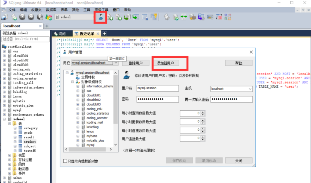 - 必须拥有mysql数据库的全局CREATE USER权限,或拥有INSERT权限。