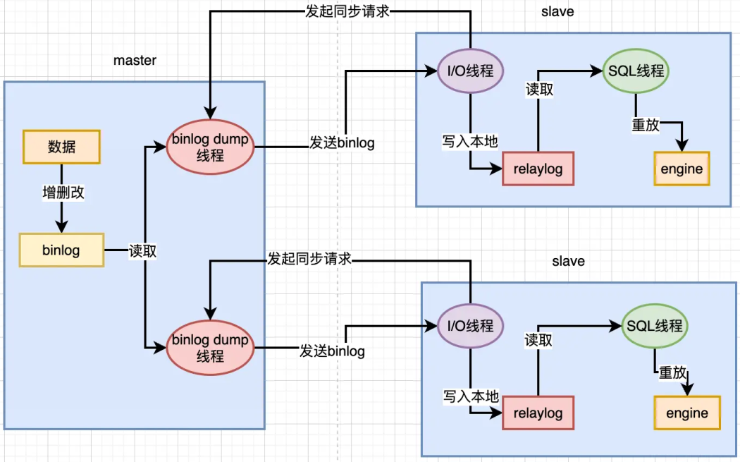 SQL 线程也是在 Slave 中创建的,当 Slave 检测到中继日志有更新,就会将更新的内容同步到 Slave 数据库中,这样就保证了主从的数据的同步。