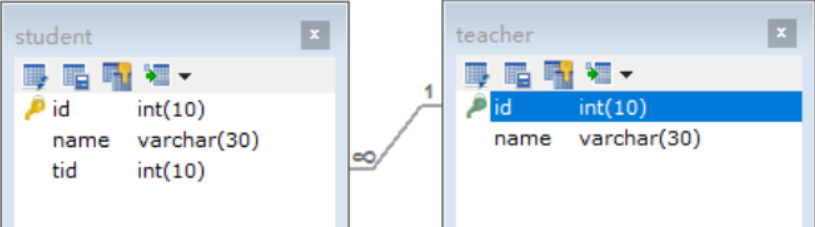 - 如果对于学生这边,就是一个多对一的现象,即从学生这边关联一个老师!